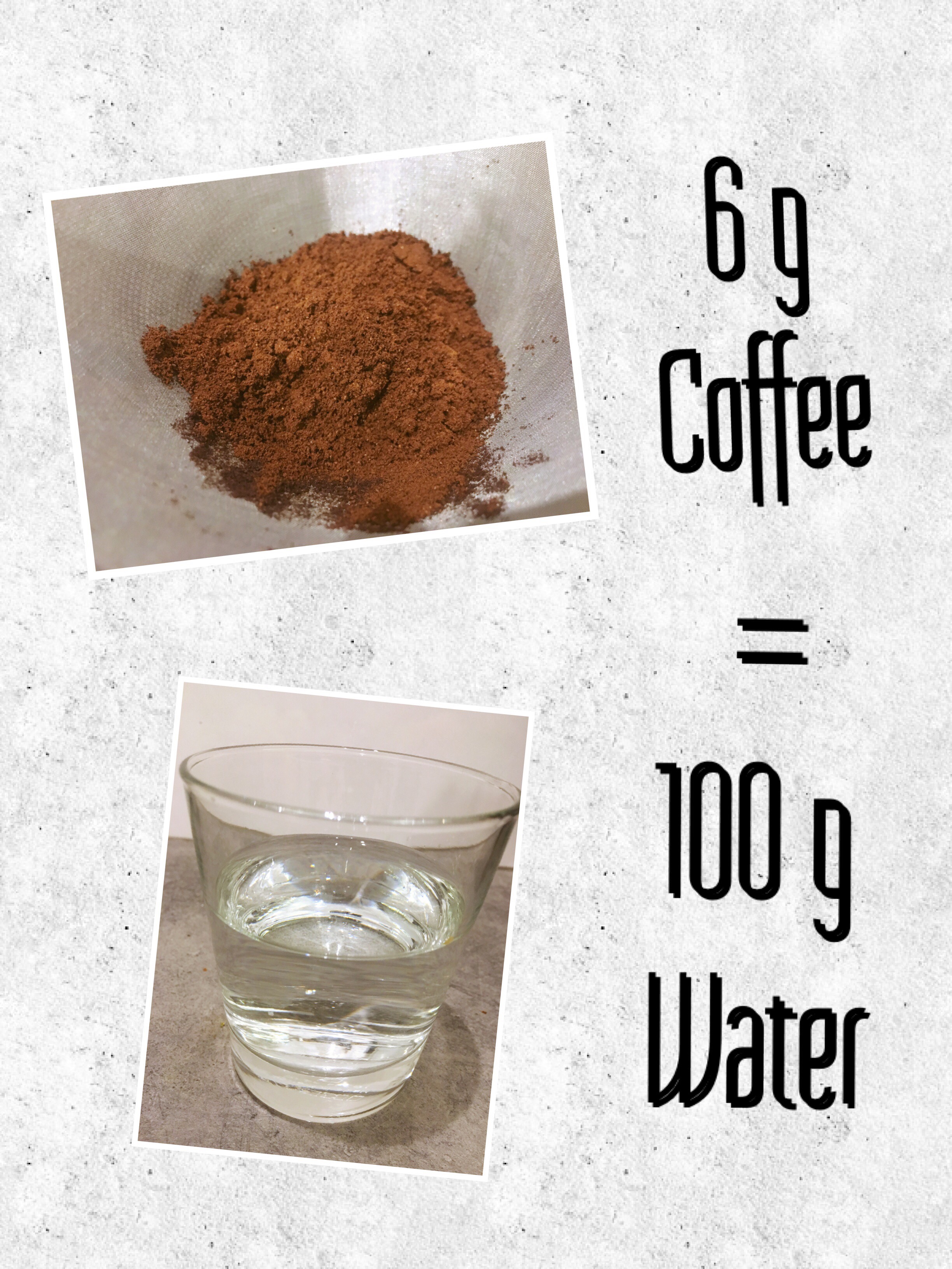 - Weigh the coffee – 6g coffee for 100g water.
