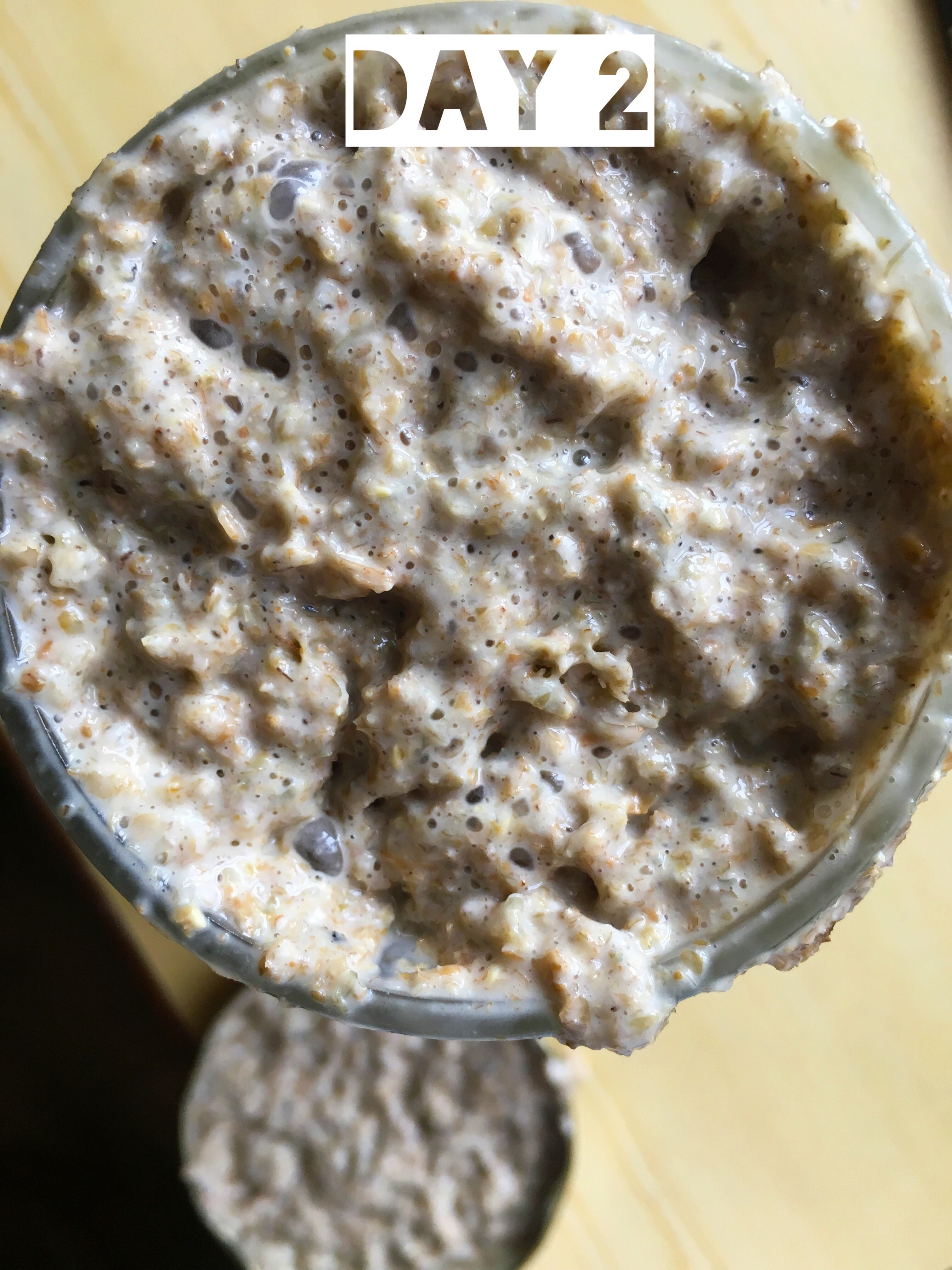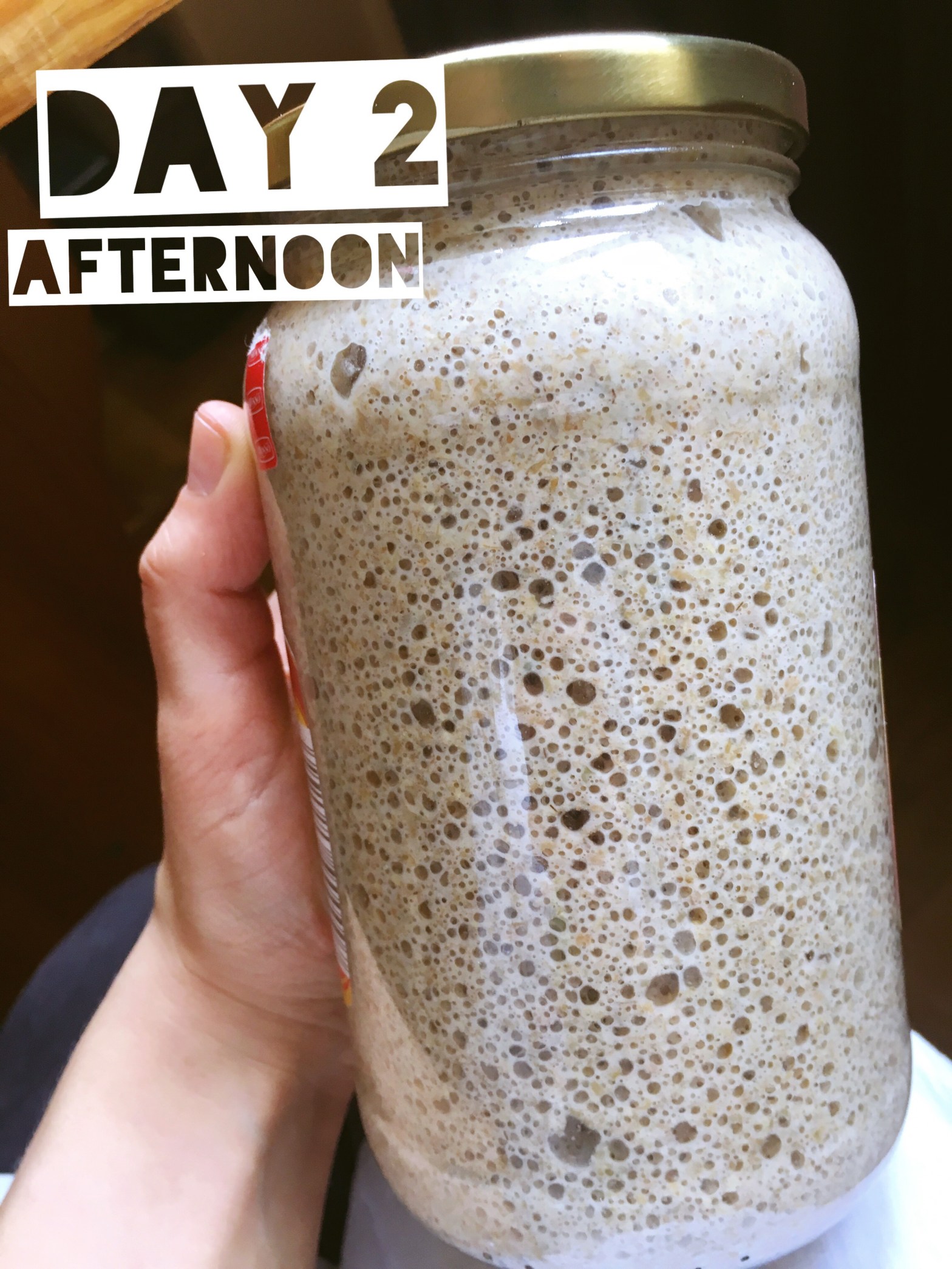 In the morning I add to the jar the same amount of the flour and water as yesterday and mix it Well. Set aside. Stir again in the evening or earlier it the dough is running away from the jar. 😉