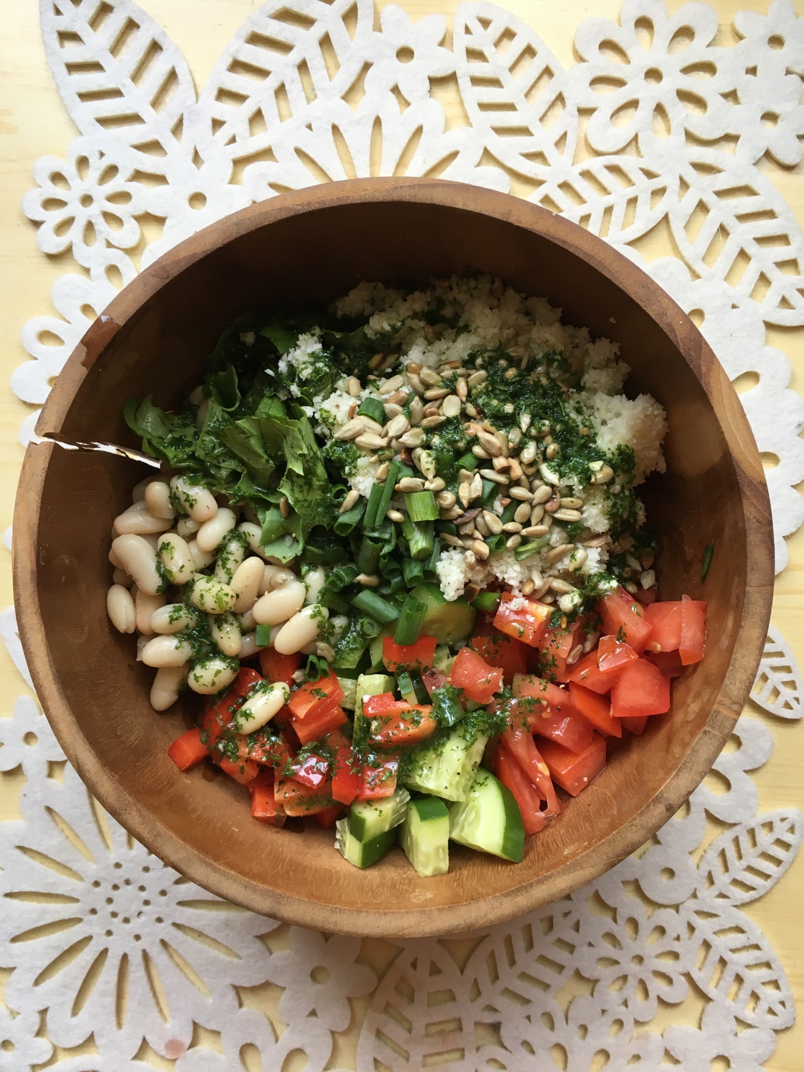 Wszystkie składniki ładnie ułóż w misce – najlepiej takiej jak moja – drewnianej przywiezionej z Bali 😉 – polej sosem. Gotowe!