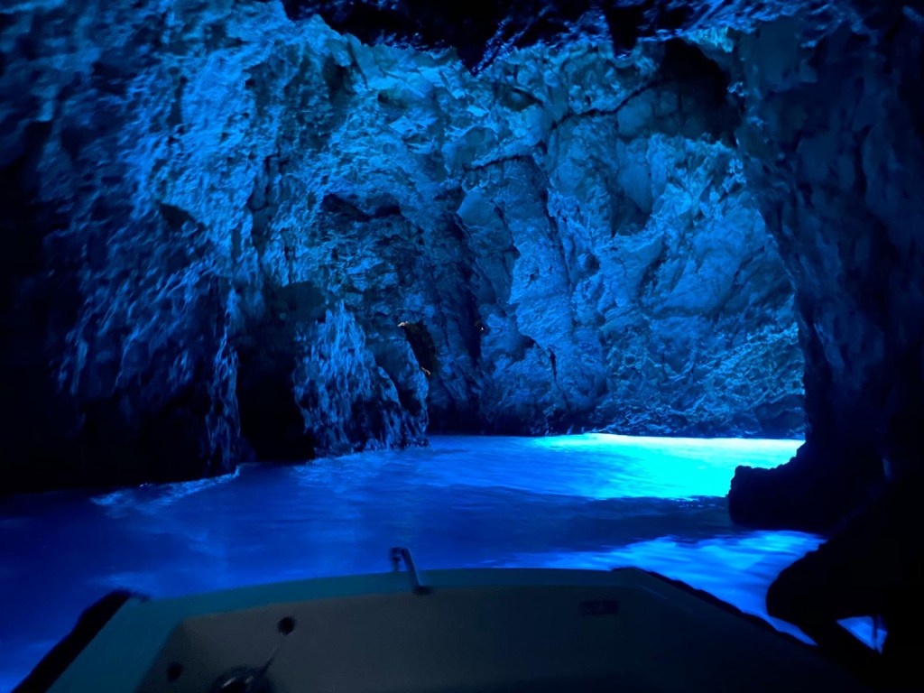 Do naszego katamaranu „zaparkowanego” w zatoczce obok podpływa mała łódeczka, która zabierze nas do jaskini. Koszt – 70 kun na osobę. Żeby wpłynąć do środka trzeba mieć całkiem niezłe umiejętności – ogólnie miałam wrażenie, że nasza łódka się tam nie zmieści – zdziwiłam się jeszcze bardziej jak zobaczyłam, że w środku jest kolejna.