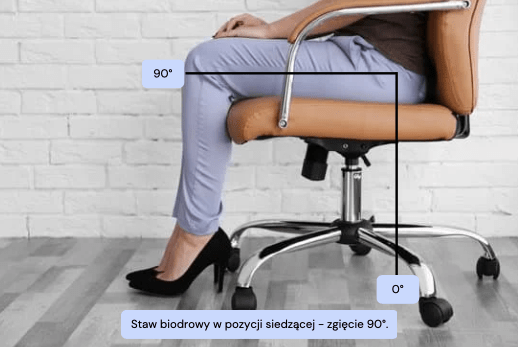 Cały koncept treningu mobility wytłumaczę na przykładzie. Załóżmy, że w ciągu dnia dużo siedzicie. Przyjrzyjmy się pozycji stawu biodrowego w pozycji siedzącej. Otóż staw biodrowy jest w pozycji zgięcia, jest to ok. 90 stopni, jest to wersja pasywna – nogi oparte o krzesło, nie trzeba dużo siły, by pozycję siedzącą utrzymać (opieramy plecy i nogi).