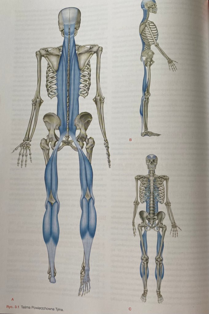Na zdjęciu po lewej Taśma Powierzchowna Tylna wg Myersa. Taśma zaczyna się na powierzchni podeszwowej paliczków palców stóp, obejmuje powięź podeszwową i krótkie zginacze palców, przyczepia się do kości piętowej, dalej obejmuje ścięgno Achillesa i mięsień brzuchaty łydki, kłykcie kości udowej, mięśnie kulszowo-goleniowe, guzy kulszowe, więzadło krzyżowo-guzowe, kość krzyżową, powięź krzyżowo-lędźwiową, prostownik grzbietu, grzebień potyliczny, czepiec ścięgnisty, rozcięgno naczaszne aż dochodzi do kości czołowej i brzegu nadoczodołowego.